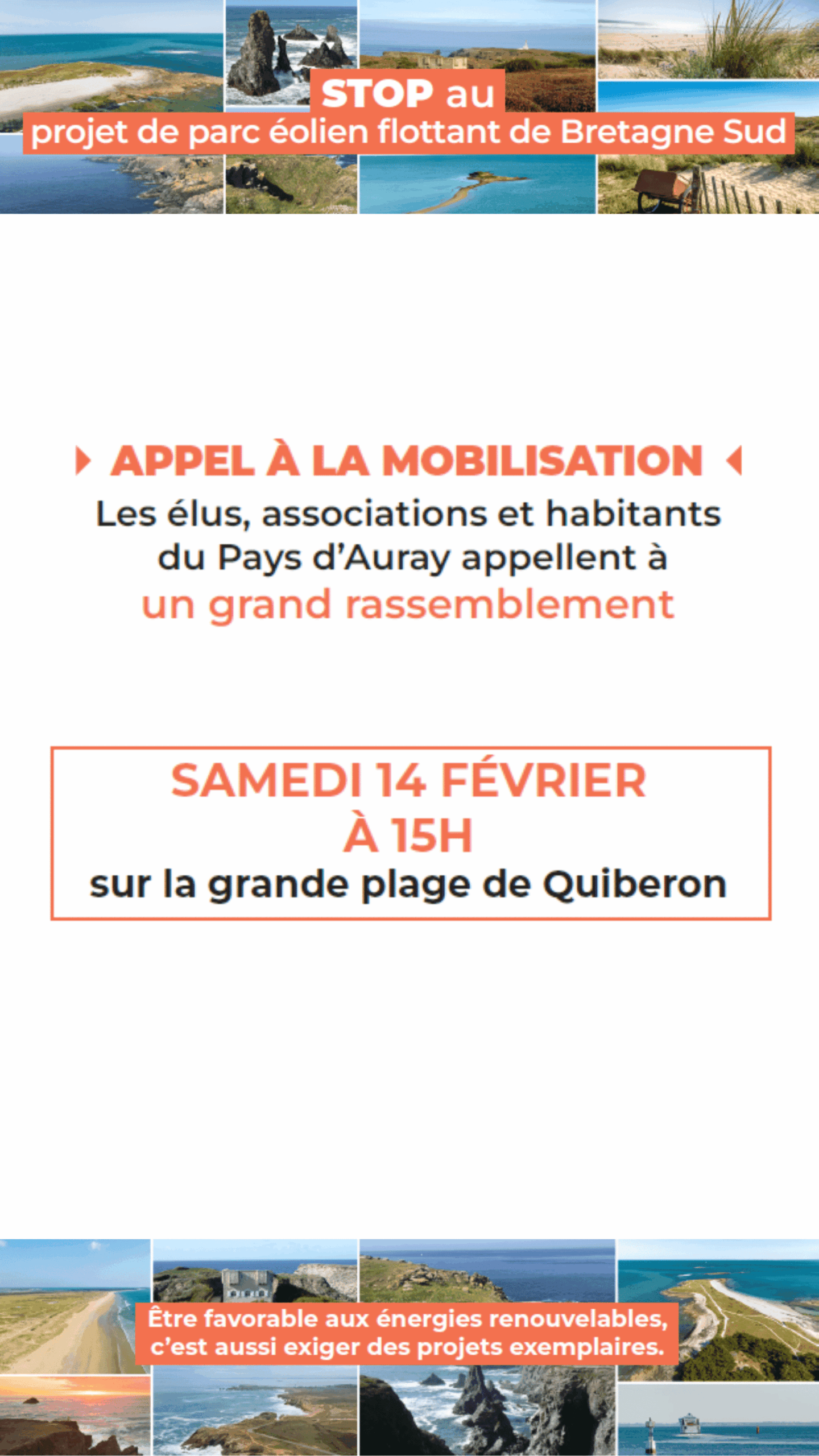 Les élus, associations et habitants du Pays d’Auray appellent à une mobilisation collective face au projet de parc éolien flottant envisagé à quelques kilomètres de nos côtes.