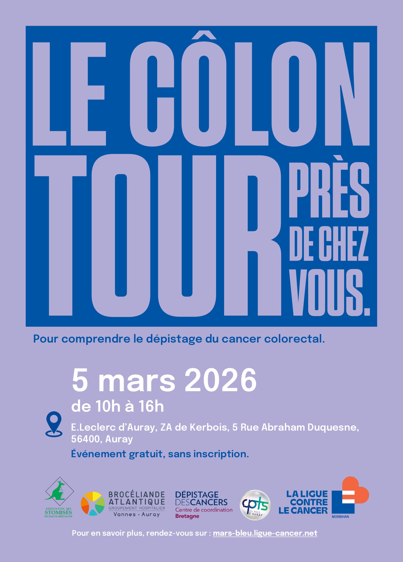 Les professionnels des services de Gastro-entérologie et d’Oncologie du CHBA, en partenariat avec la Ligue contre le Cancer du Morbihan, la CPTS du Pays d’Auray, le Centre de Coordination Bretagne de Dépistage des Cancers (CRCDC) et l’association des Stomisés de Haute-Bretagne seront présents pour informer le grand public et sensibiliser au dépistage du cancer colorectal.