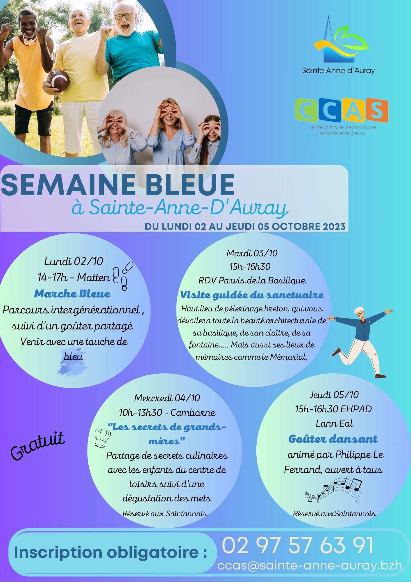 Le CCAS de Sainte-Anne-d’Auray propose aux personnes âgées des communes voisines certaines animations organisées dans le cadre de la Semaine bleue du 02 au 05 octobre 2023.