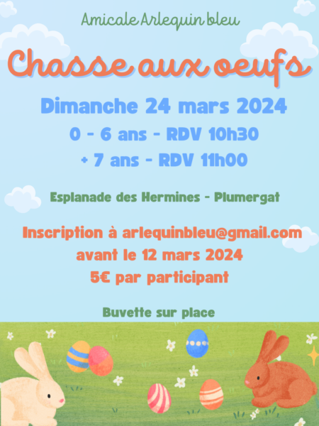 Featured Mis en avant 24/03/2024 à 10h30 Chasse aux Œufs (Amicale laïque L’Arlequin Bleu) Prairie "Espace Les Hermines" Rue Joseph Evenas, Plumergat