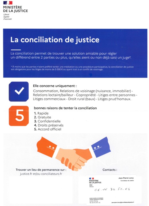 Le conciliateur de justice Cliquer pour agrandir Plus d’informations : Conciliateur de justice | Service-Public.fr Retour vers les actualités